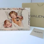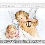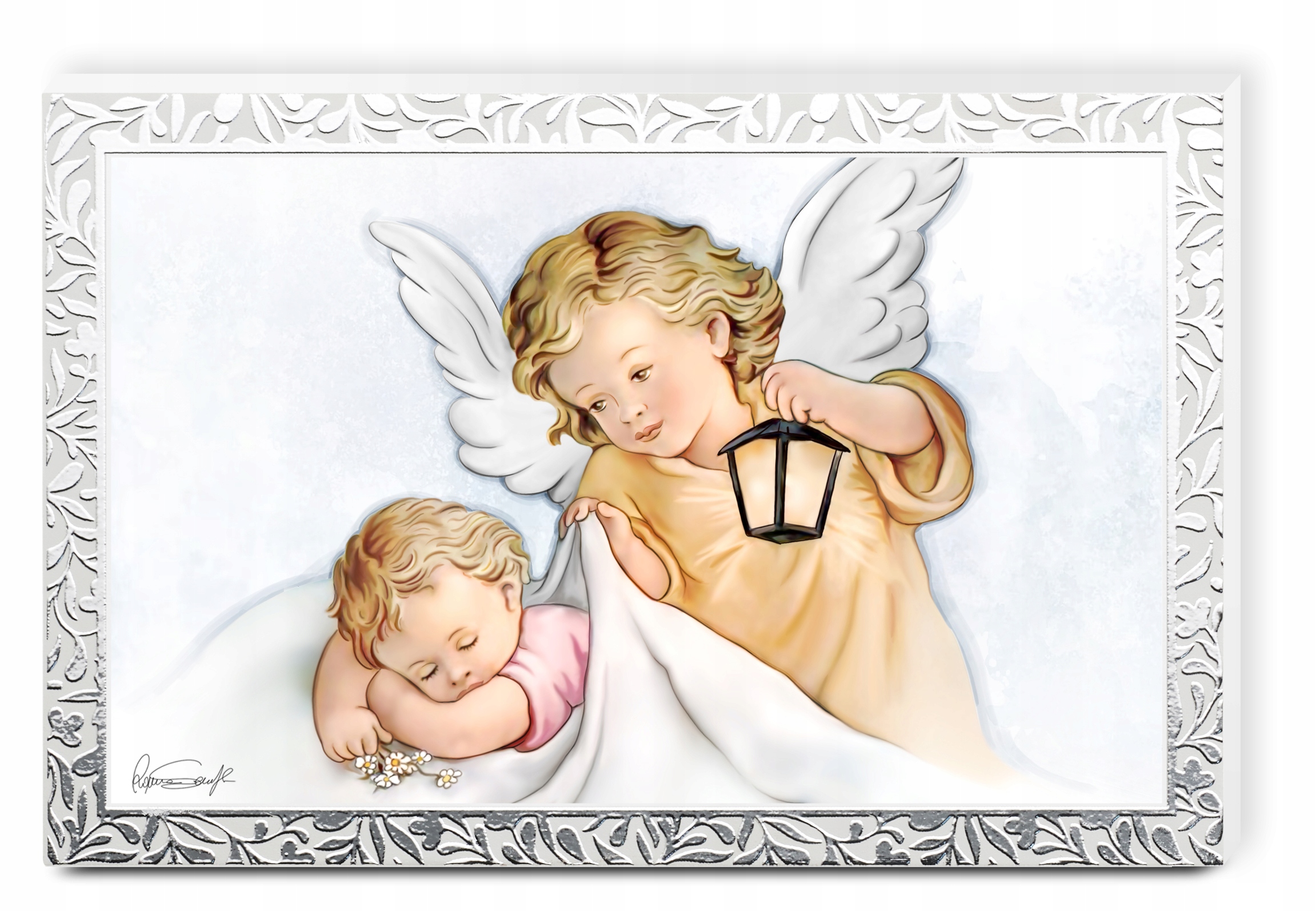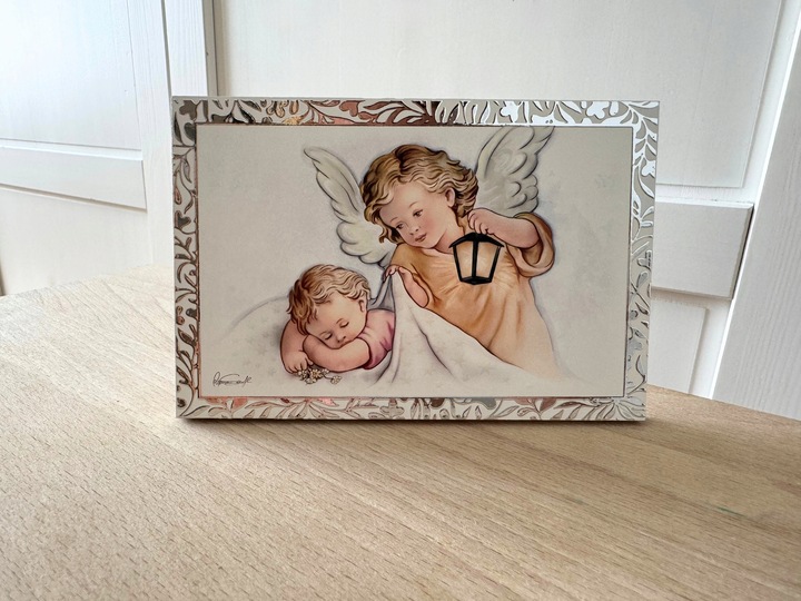 Obrazek na zdobionym srebrem białym panelu Valenti Anioł Stróż z latarnią i Dzieciątkiem 13,5x9cm