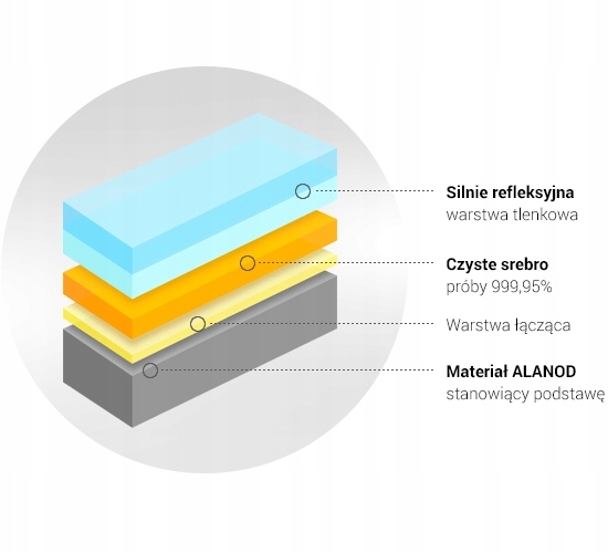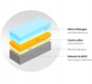 w którym warstwa bazowa ALANOD została w procesach atomowych pokryta czystym srebrem. Dzięki częściowemu piaskowaniu otrzymano niesamowity efekt połączenia elementów błyszczących oraz satynowych. Następnie zabezpieczona została silnie refleksyjną warstwą chroniącą przed utlenianiem.