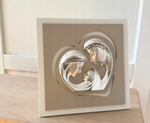 Na drewienku umieszczona jest figurka srebrna z wizerunkiem Świętej Rodziny w kształcie serca. Figurka tworzy efekt trójwymiarowości, dzięki czemu obrazek nabiera wyjątkowego i niepowtarzalnego charakteru.