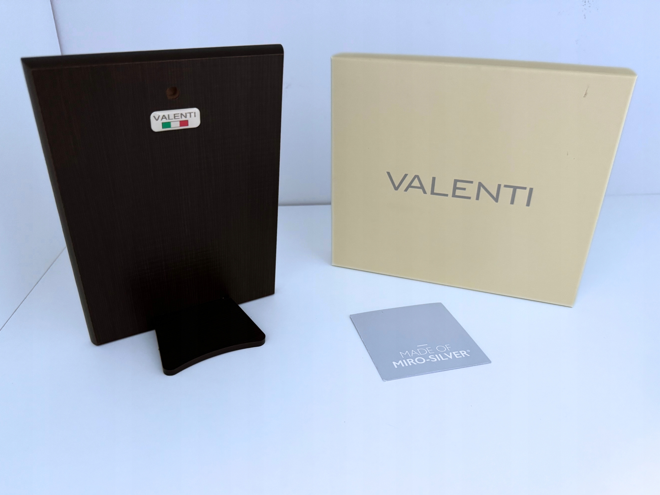 Znajdziesz też w nim oryginalną ulotkę producenta w języku włoskim i angielskim wraz z certyfikatem autentyczności oraz informację o sposobie pielęgnacji. Do czyszczenia należy używać jedynie miękkiej ściereczki bądź letniej wody. Nie wolno stosować żadnych środków czyszczących, również tych przeznaczonych do czyszczenia srebra.