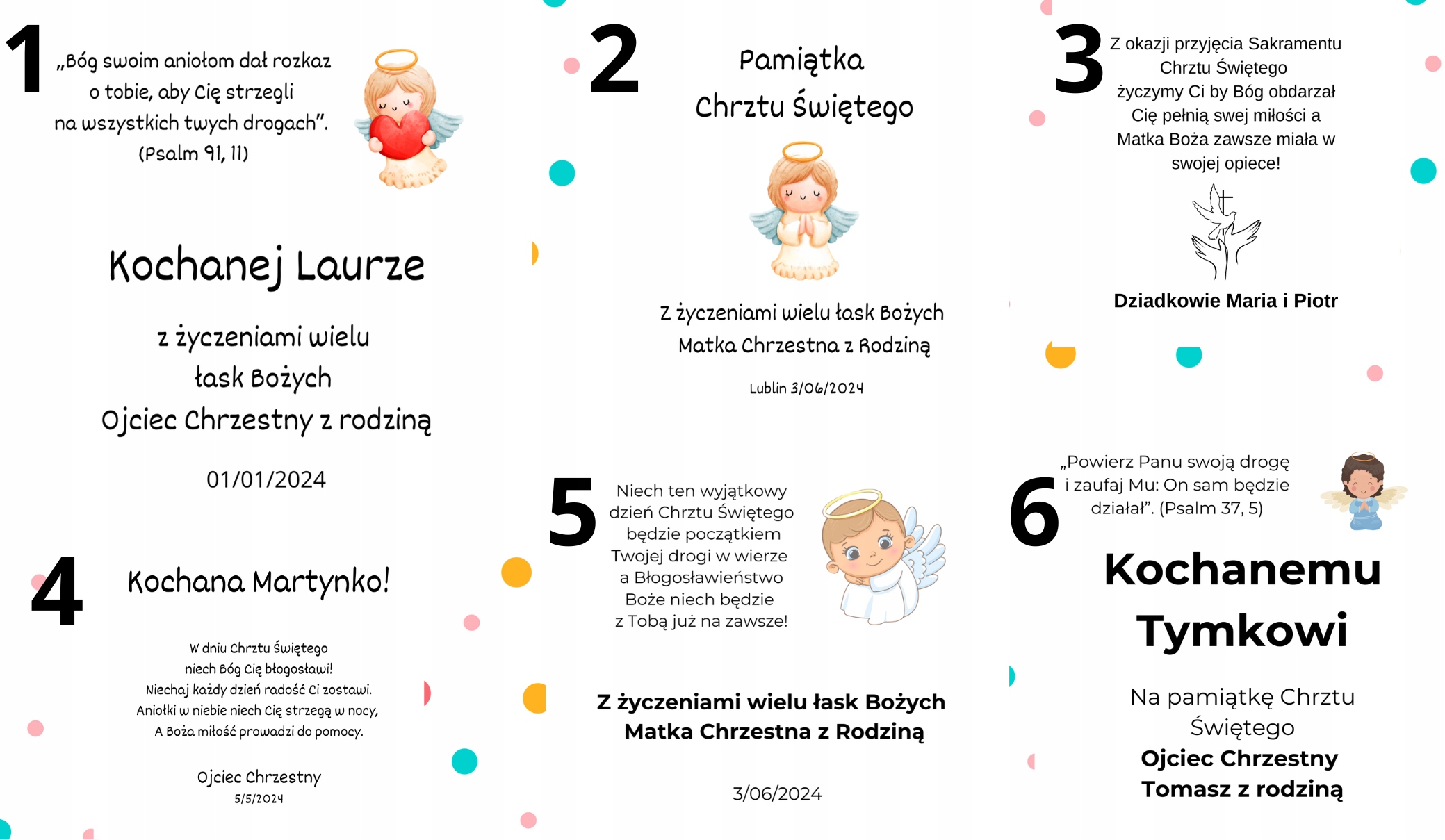 I.  „W dniu chrztu świętego, niech Bóg Cię błogosławi, Niechaj każdy dzień radość Ci zostawi. Aniołki w niebie niech Cię strzegą w nocy, A Boża miłość prowadzi do pomocy.”