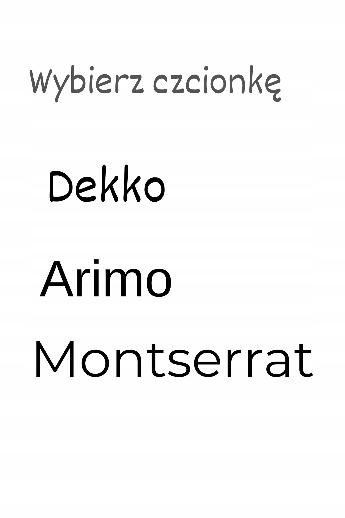 1. Proszę wybrać czcionkę: Dekko, Arimo lub Montserrat